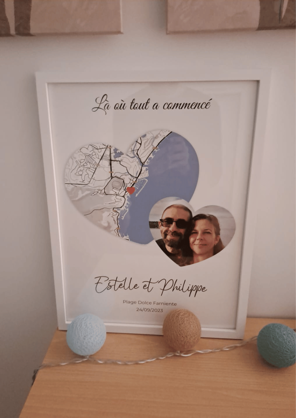 "Idée cadeau de Saint-Valentin, offerte à ma femme. Je suis plus que ravie du résultat et de l'originalité du cadeau ! Elle a été agréablement surprise et ravie de ce beau souvenir de notre rencontre. Nous adorons, vraiment. Merci"