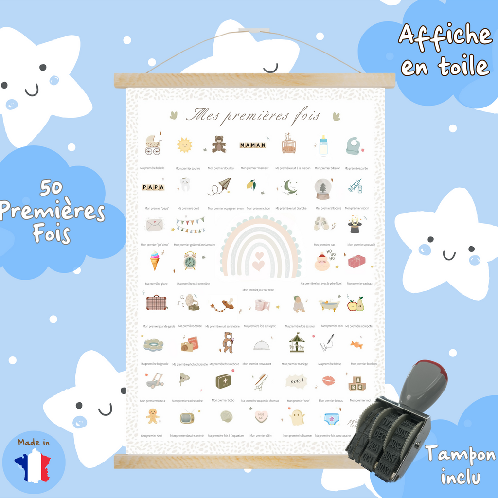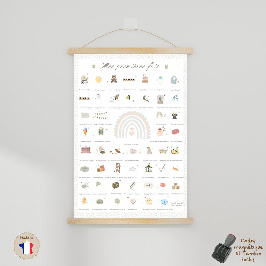 L'affiche "Mes premières fois" est conçue pour vous permettre de noter et de conserver les moments importants de la vie de votre enfant. Elle est généralement composée d'une série de cases ou de lignes où vous pouvez écrire les différentes "premières fois" de votre enfant, comme sa première dent, sa première sortie au parc, sa première fête d'anniversaire, etc. Certaines affiches "Mes premières fois" ont également des espaces pour y coller des photos, des empreintes de main ou de pied, ou même pour y tamponner des souvenirs spéciaux.
