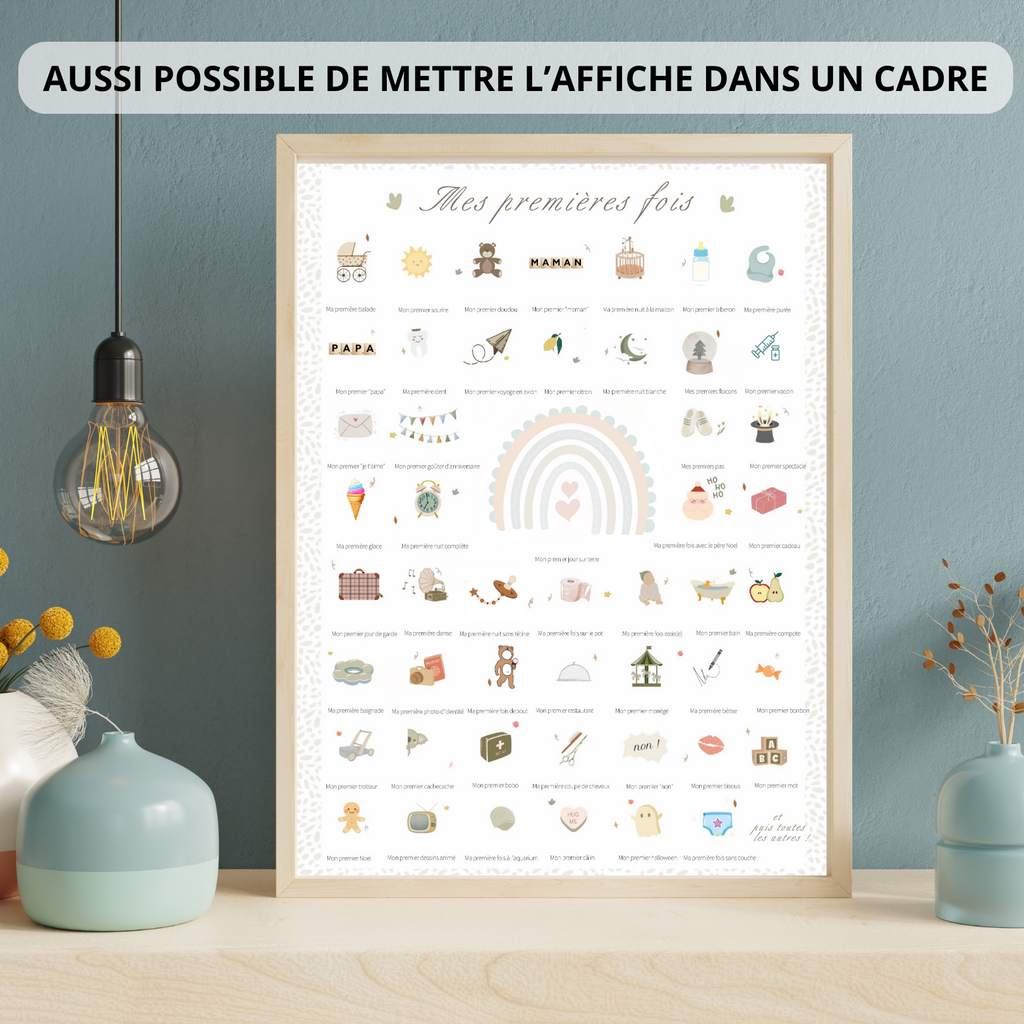L'affiche "Mes premières fois" peut également être utilisée comme une pièce maîtresse de décoration dans la chambre de bébé. Vous pouvez l'encadrer et l'accrocher au-dessus du berceau ou de la table à langer pour ajouter une touche personnelle et unique à l'espace. Vous pouvez également l'intégrer dans une galerie murale en l'associant à d'autres œuvres d'art ou à des photos de famille. L'affiche "Mes premières fois" apportera une touche de douceur et de nostalgie à la chambre de bébé et sera un rappel constant des moments précieux de sa vie.
