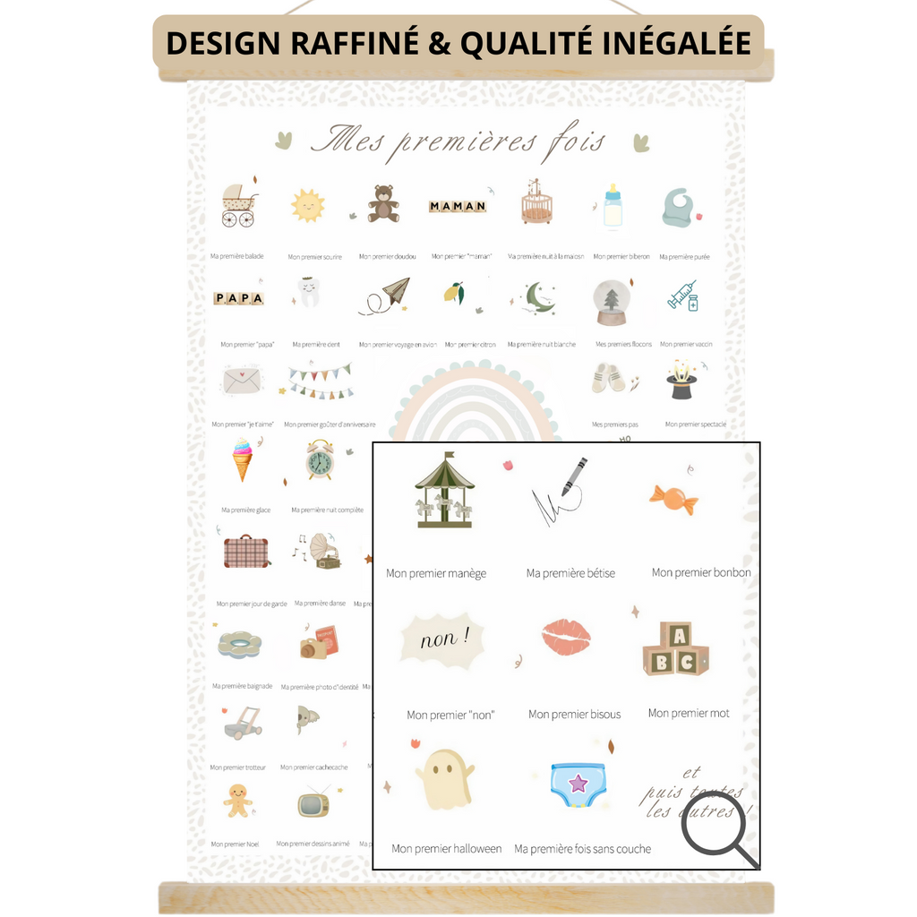 L'affiche "Mes premières fois" est un véritable trésor de souvenirs. Elle permet de noter toutes les premières fois du bébé, comme son premier sourire, son premier mot, sa première dent, etc. Chaque moment précieux peut être inscrit sur l'affiche, ce qui en fait un cadeau vraiment spécial.